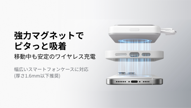 効率的にワイヤレス充電を行っていただくために、スマートフォンの受電部分の中心とモバイルバッテリーの送電部分の中心が大きくずれないように配置してください。また、厚みのあるケースや金属製ケースの使用を控え、公式マグネット式ケースまたは、薄型ケース(厚さ2.5mm以下)をご使用ください。