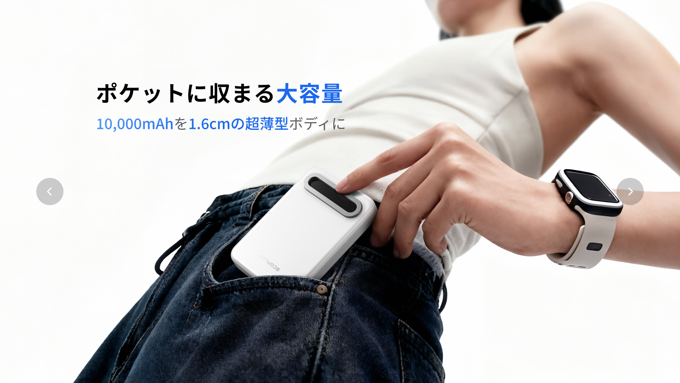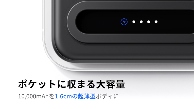 iPhoneを約1.7回充電できる10,000mAhの大容量をわずか1.6cmの超薄型ボディに。ポケットやインナーケース、小さいハンドバッグでも邪魔にならず持ち運べます。スマートフォンをセットしても片手で使いやすいスリムなデザインです。
