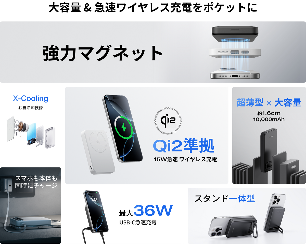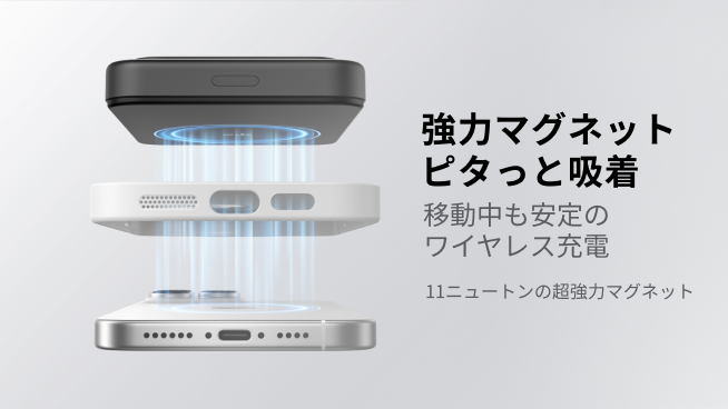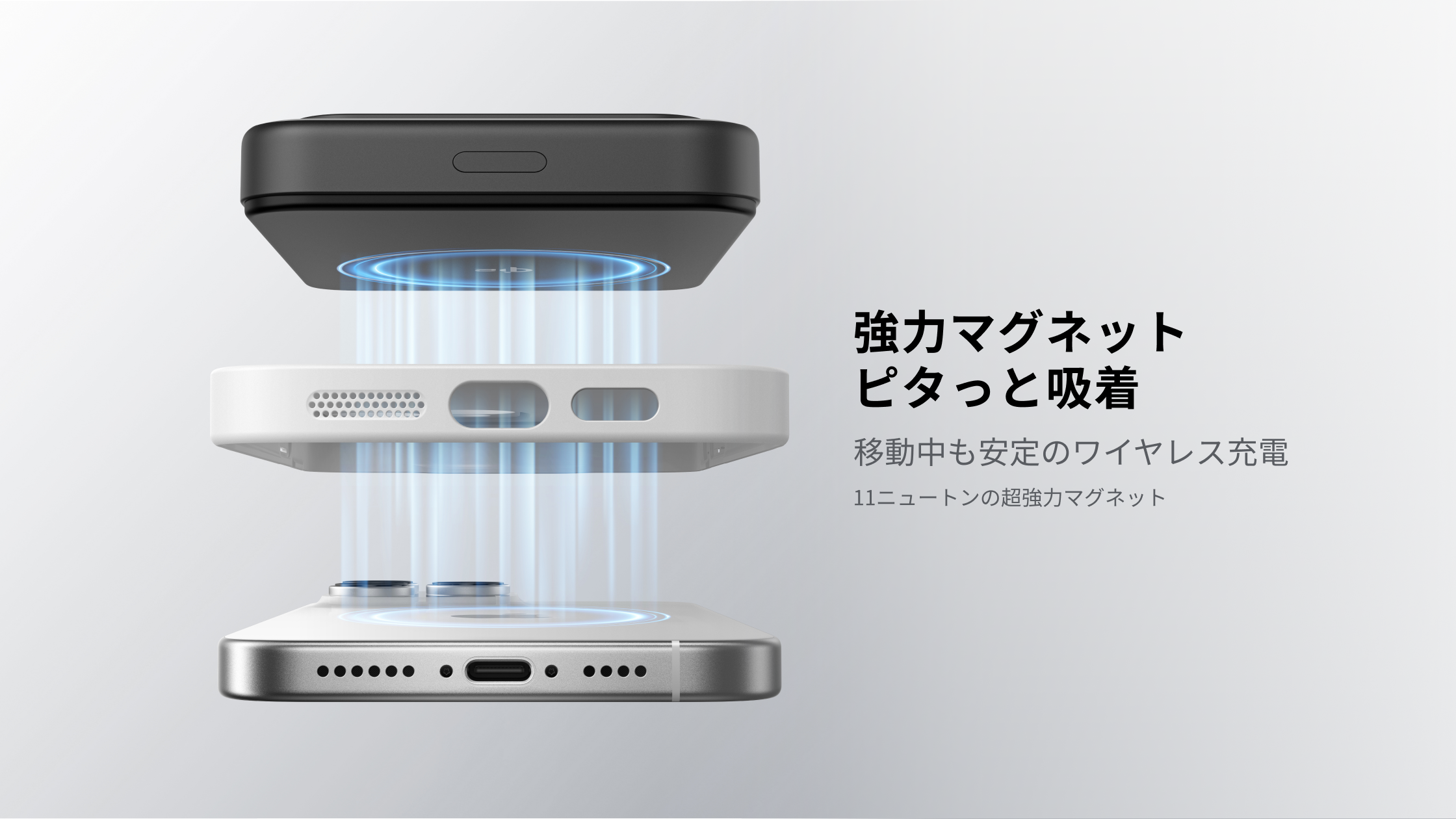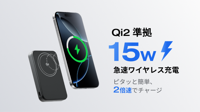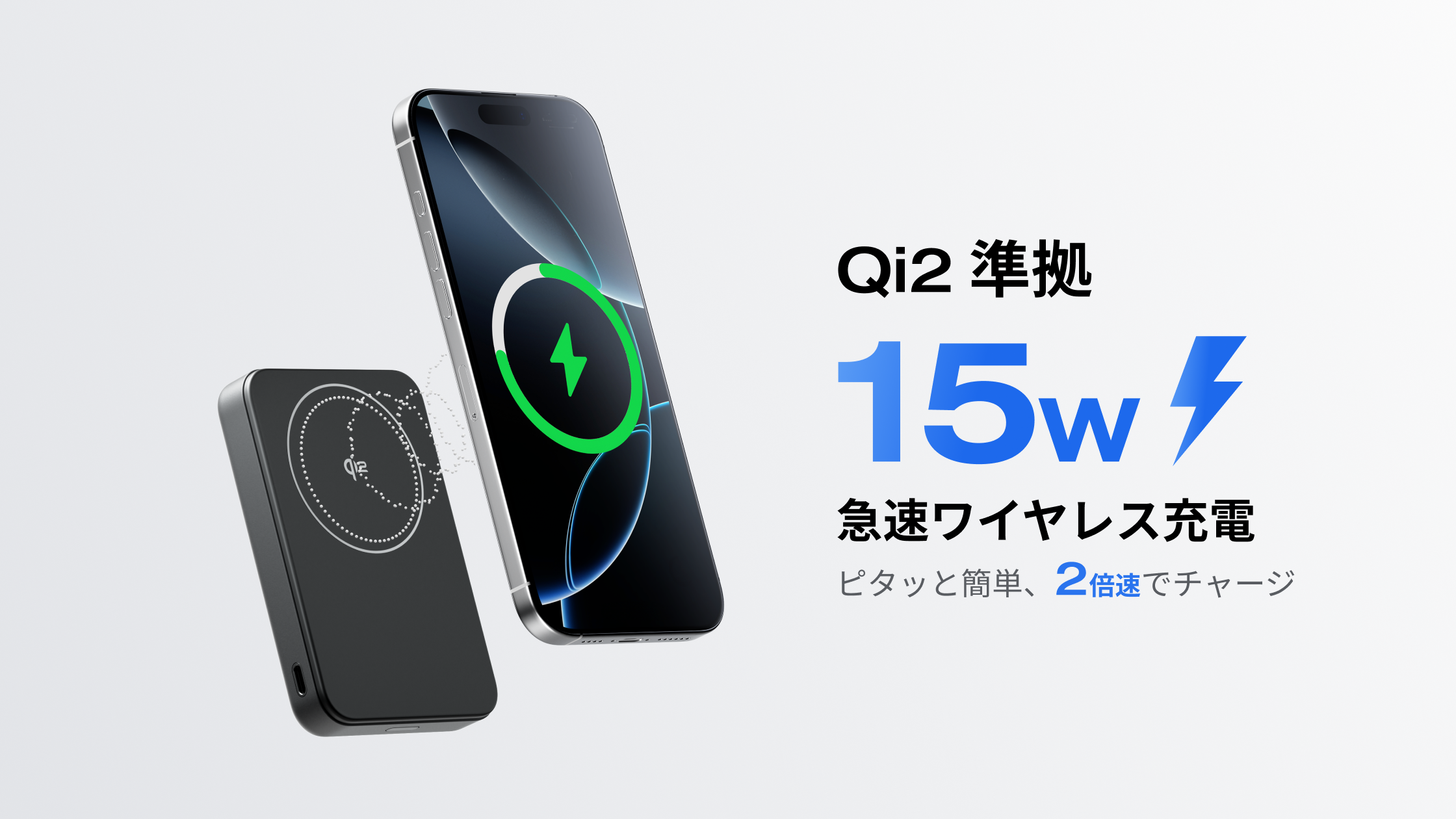 Qi2ワイヤレス充電規格に準拠し、最大15Wの急速ワイヤレス充電を実現。最大7.5WのQi1規格に比べて2倍のスピードで急速充電が可能です。