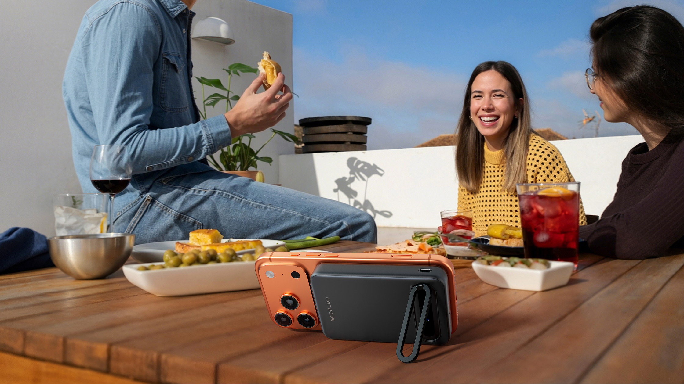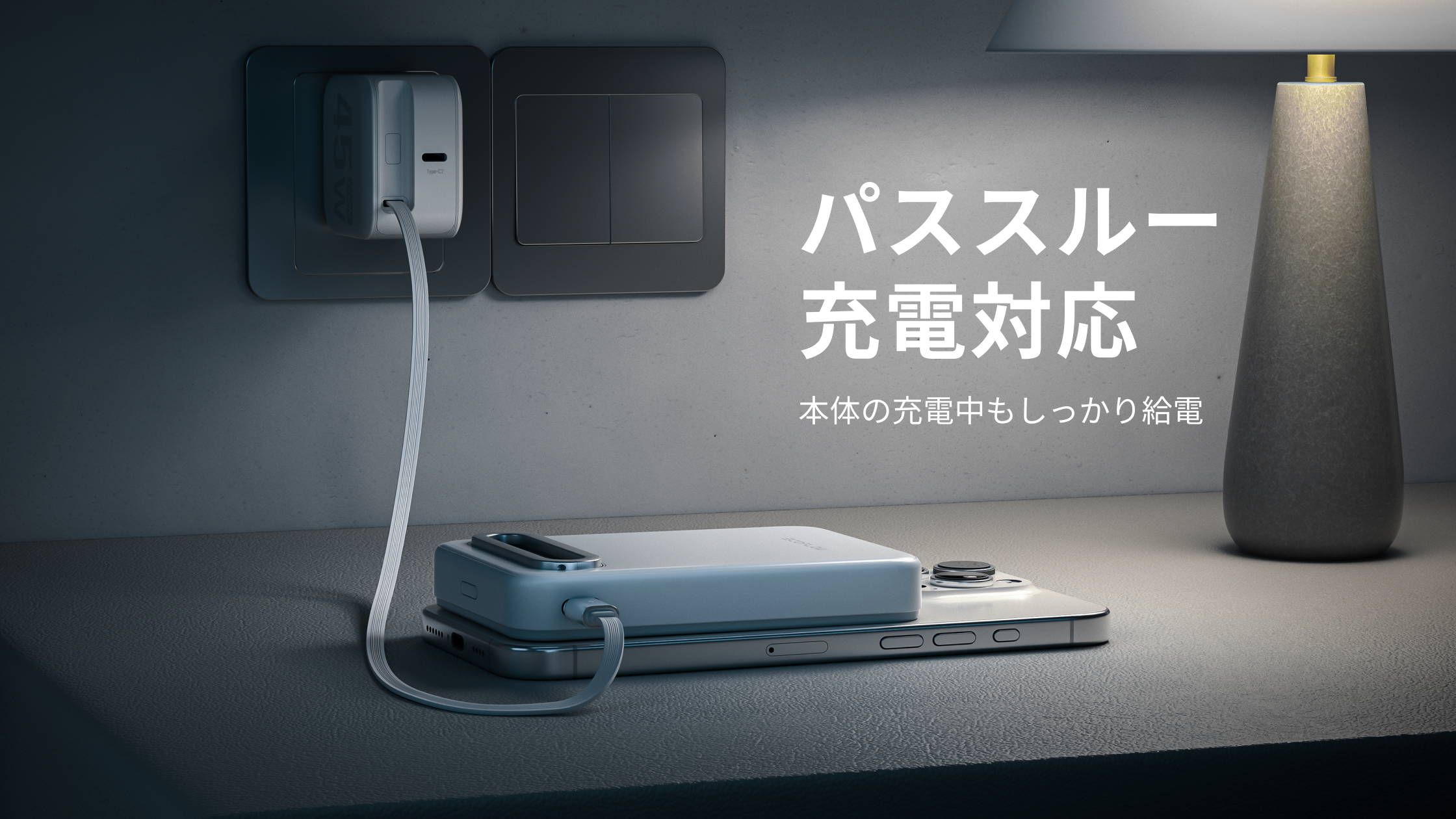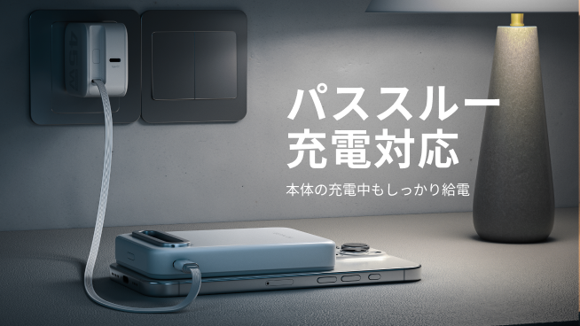 パススルー充電対応により、本体を充電しながら他のデバイスに給電可能。充電中のRAPIDが、お手軽ワイヤレス充電パッドに。寝ている間、充電中のRAPIDにスマホを置いておくだけで、翌朝にはどちらもしっかりフル充電。