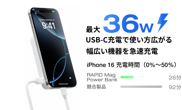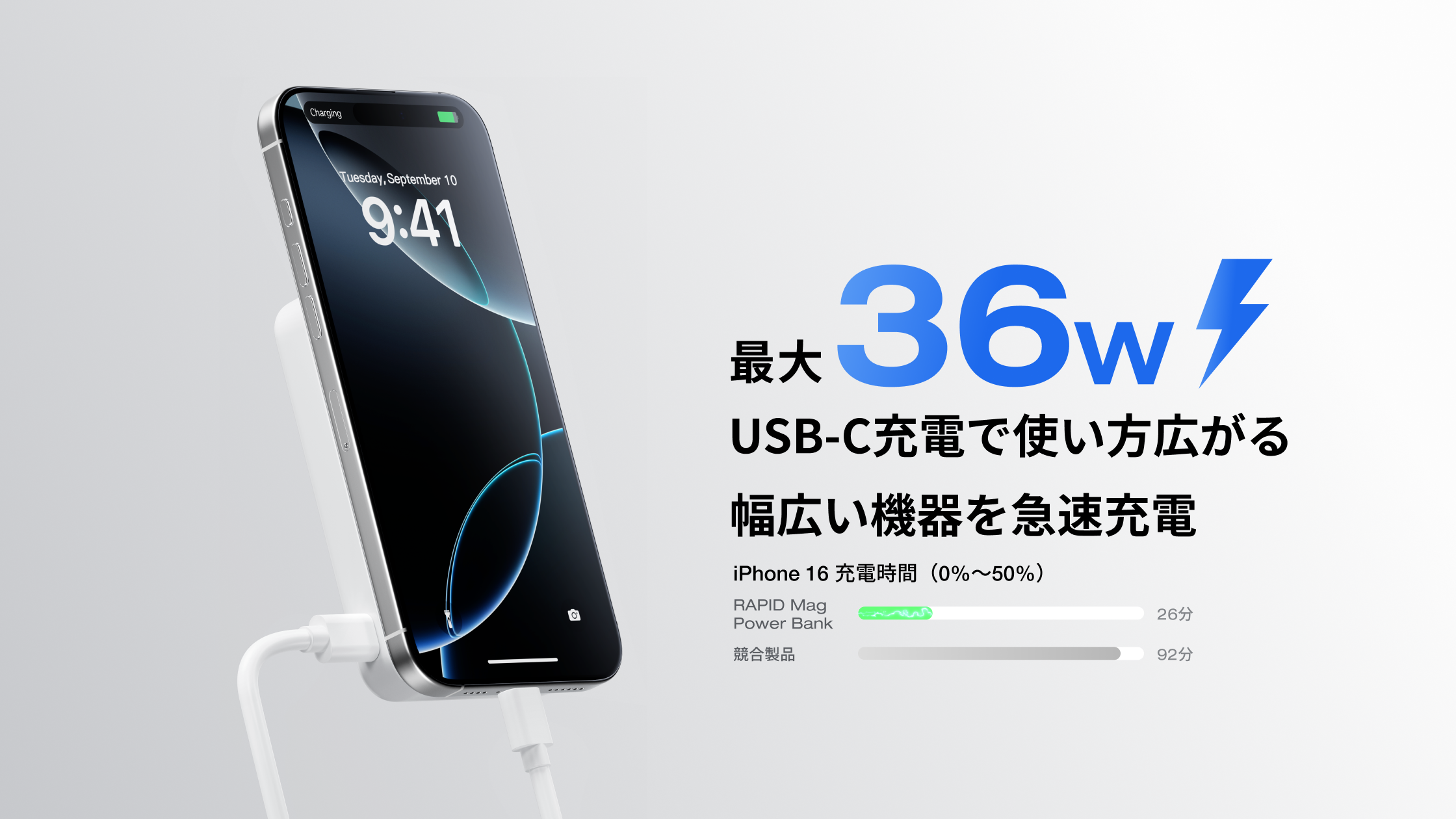 USB-C入出力ポートを1つ搭載しているため、ケーブルを接続すれば最大36Wの急速充電が可能。iPhoneはもちろん、イヤホンやスマートウォッチなど幅広い機器に対応します。