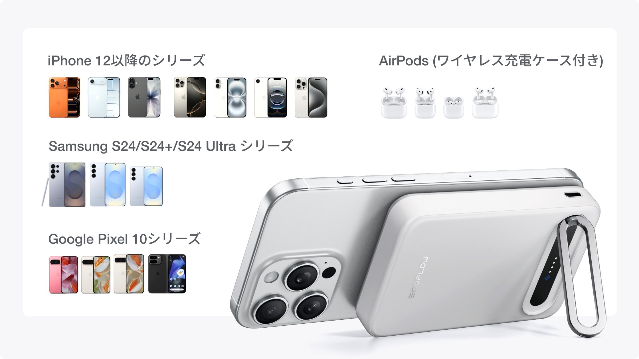 ほとんどの Androidスマートフォンに対応しています。ただし、本製品はAndroidスマートフォン独自のワイヤレス充電プロトコルに対応していません。そのため、より快適にワイヤレス充電をご使用いただくために磁気吸着機能を備えたスマートフォンケースのご使用を推奨します。