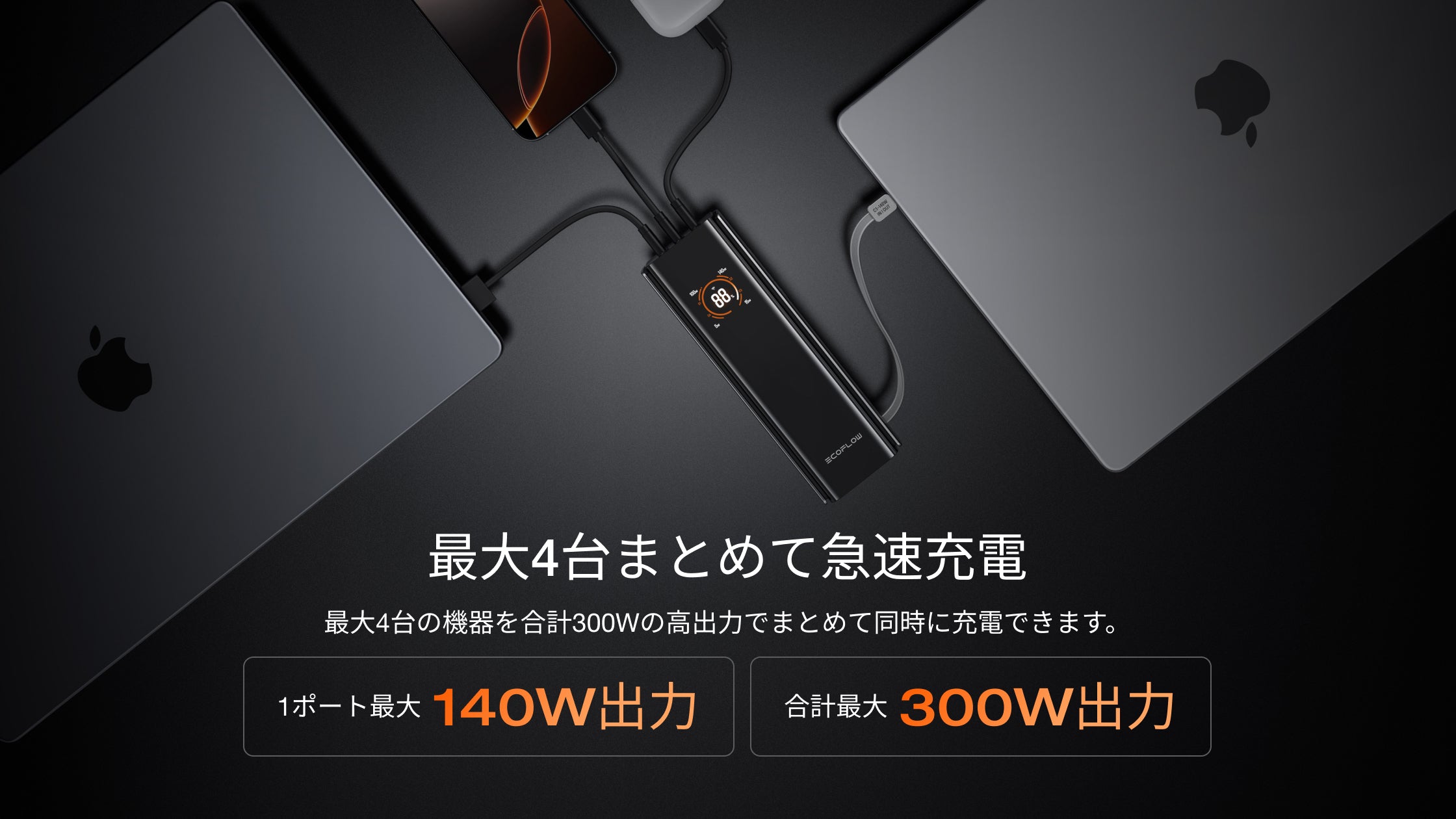 いずれの製品もパススルー充電に対応し、出力は接続デバイスの電力需要および接続ポートに応じて変化します。